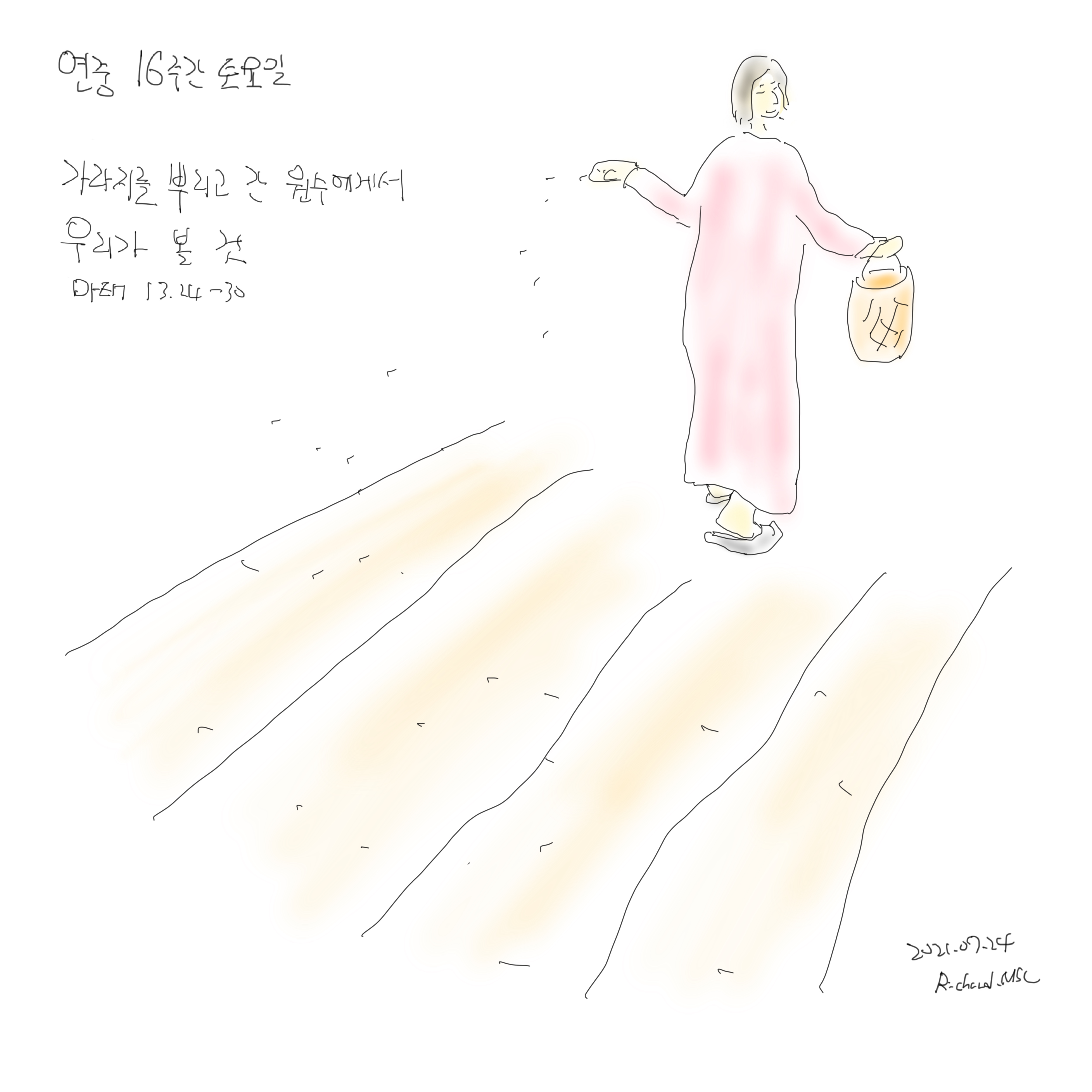 셋째, 원수는 가라지를 뿌리고는 어디로 갔을까요? 또다른 원수의 땅에도 가라지를 뿌리려고 갔을 것만 같습니다. 보통 남을 괴롭히며 자신의 시원함을 추구하는 이런 일들은 한 번으로 끝나지 않기 마련이니까요. 하지만 좋은 일을 하며 사랑을 나누는 일도 마찬가지 입니다. 사랑을 한 번 나누어 보면 그런 일도 한 번으로 끝나지 않음을 잘 알수 있습니다. 원수의 이 모습은 저에게 이렇게 묻습니다.