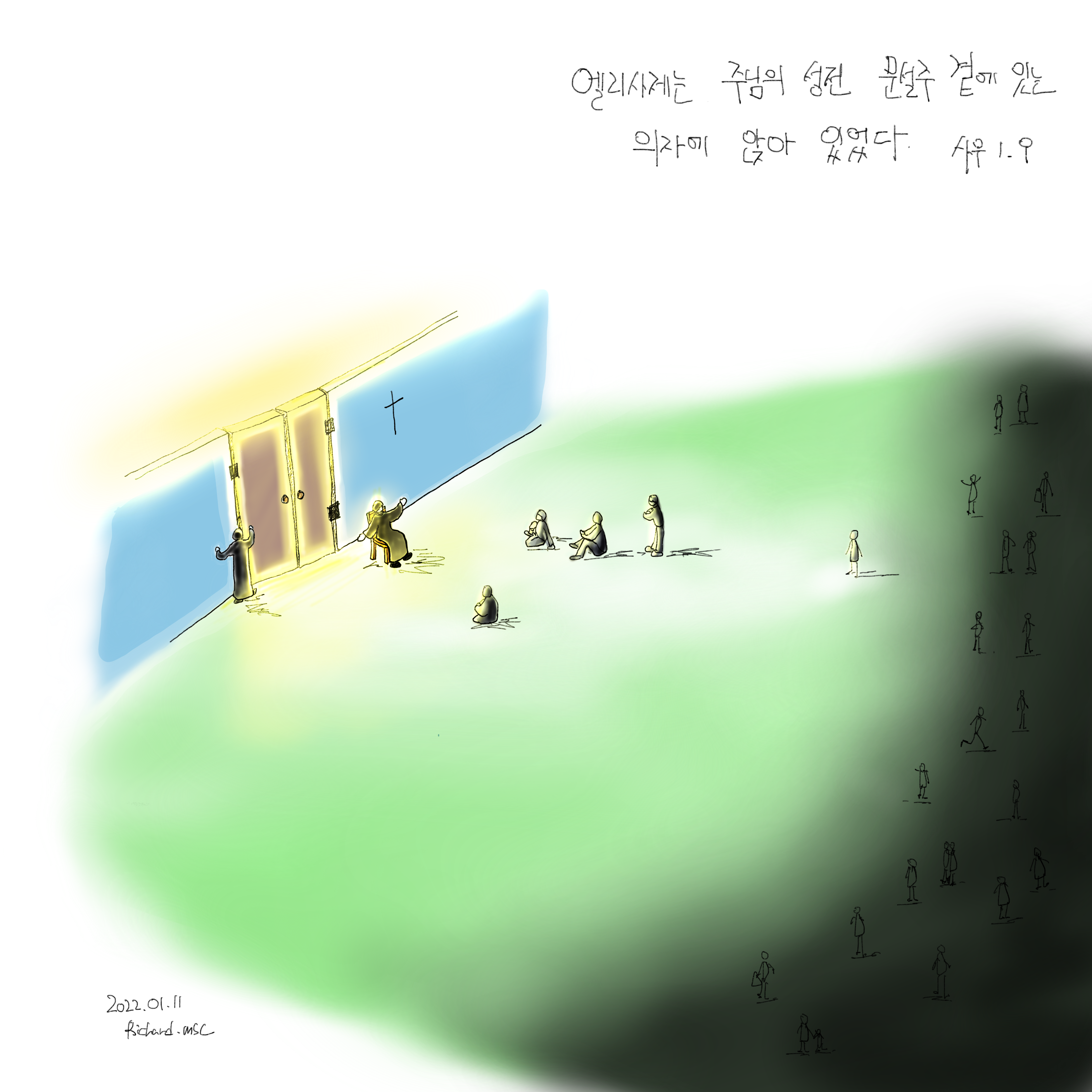 그 힌트는 오늘 1독서에 나오는 문설주에서 찾게됩니다. 문설주는 문을 만들기 위해 세우는 네모 모양의 틀 중에 양쪽 두 기둥을 의미합니다. 1독서에 나오는 엘리 사제는 주님의 성전 문설주 앞에 앉아 있습니다. 이 성전 문설주 앞에라는 공간은 매우 중요한 공간입니다. 우리가 신앙이 없는 사람들과 만나는 곳일 뿐만 아니라, 동시에 우리가 하느님과 만나는 곳입니다. 이 곳에 있는 이들은 문 밖에 있는 이를 문 안으로 초대하는 일에 있어 가장 중요한 역할을 하게 됩니다. 이 곳에 있는 이들은 문 안에서 나오는 하느님의 빛을 받고 있고, 그리하여 자신의 몸으로 그 빛을 세상으로 비추고 있습니다. 이들은 빛이 없는 어둠을 향해 달려가 외치지 않습니다. 자신의 온 몸이 빛에 쌓인 듯 화려하게 보이지도 않습니다. 그저 흘러나오는 빛을 받으며 그 곳에 앉아 있다는 것 만으로도 그들은 큰 의미를 갖습니다. 힐끔힐끔 문 안을 들여다 보며 빛을 더 알아가는 일은 덤으로 오는 행복입니다. 어둠 속의 세상은 오히려 그렇게 어렵더라도 무던히 자리를 지키고 있는 사람들에게 비추어 지는 빛을 봅니다. 그리고 그제야 그 문 안을 궁금해 합니다.