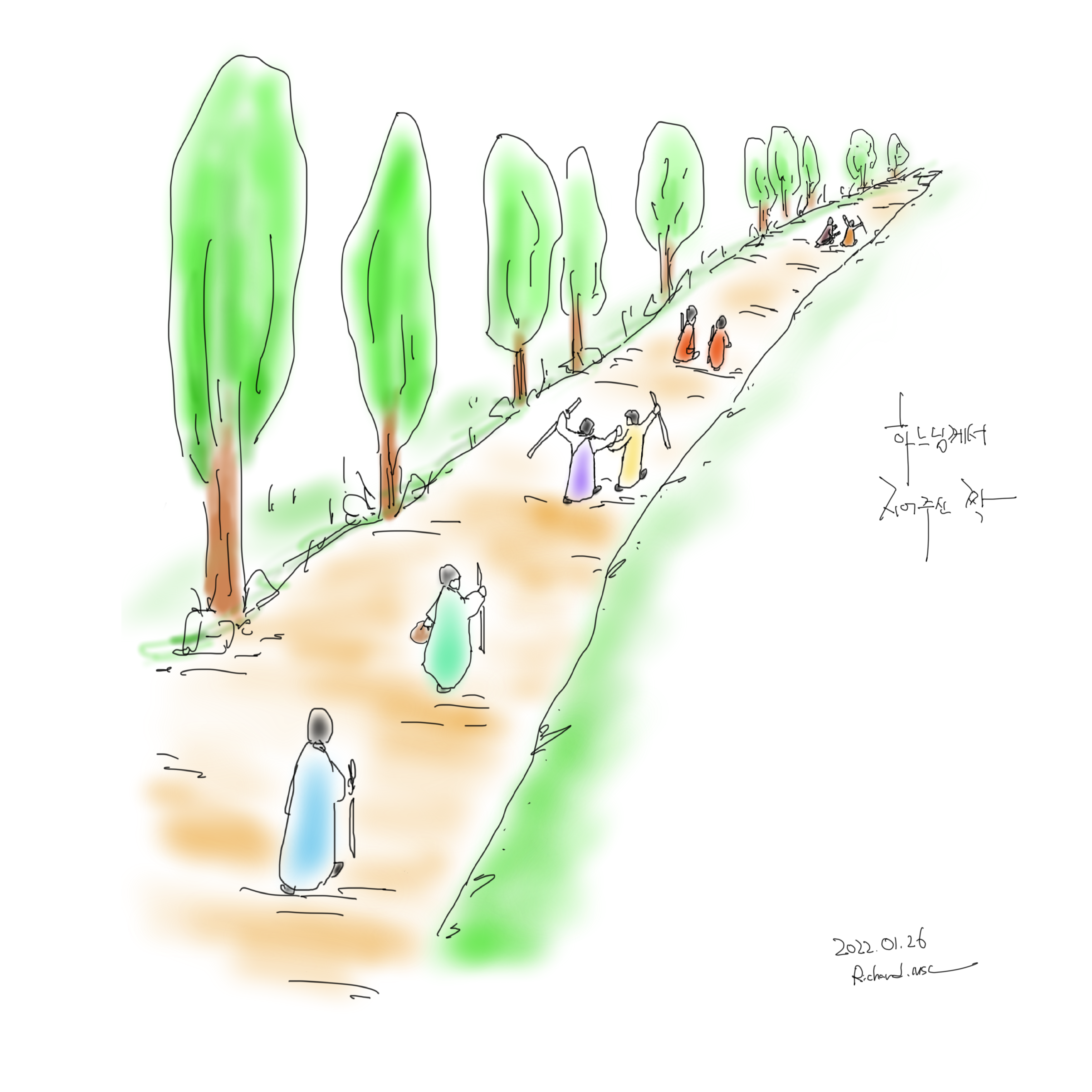 신나서 같이 뛰어가는 이들, 정답게 이야기 하면서 가는 이들, 답답해서 서로 막 다투면서 가는 이들, 또 아예 저만치 떨어져 말 없이 가는 이들, 여러 모습이 떠올랐습니다.