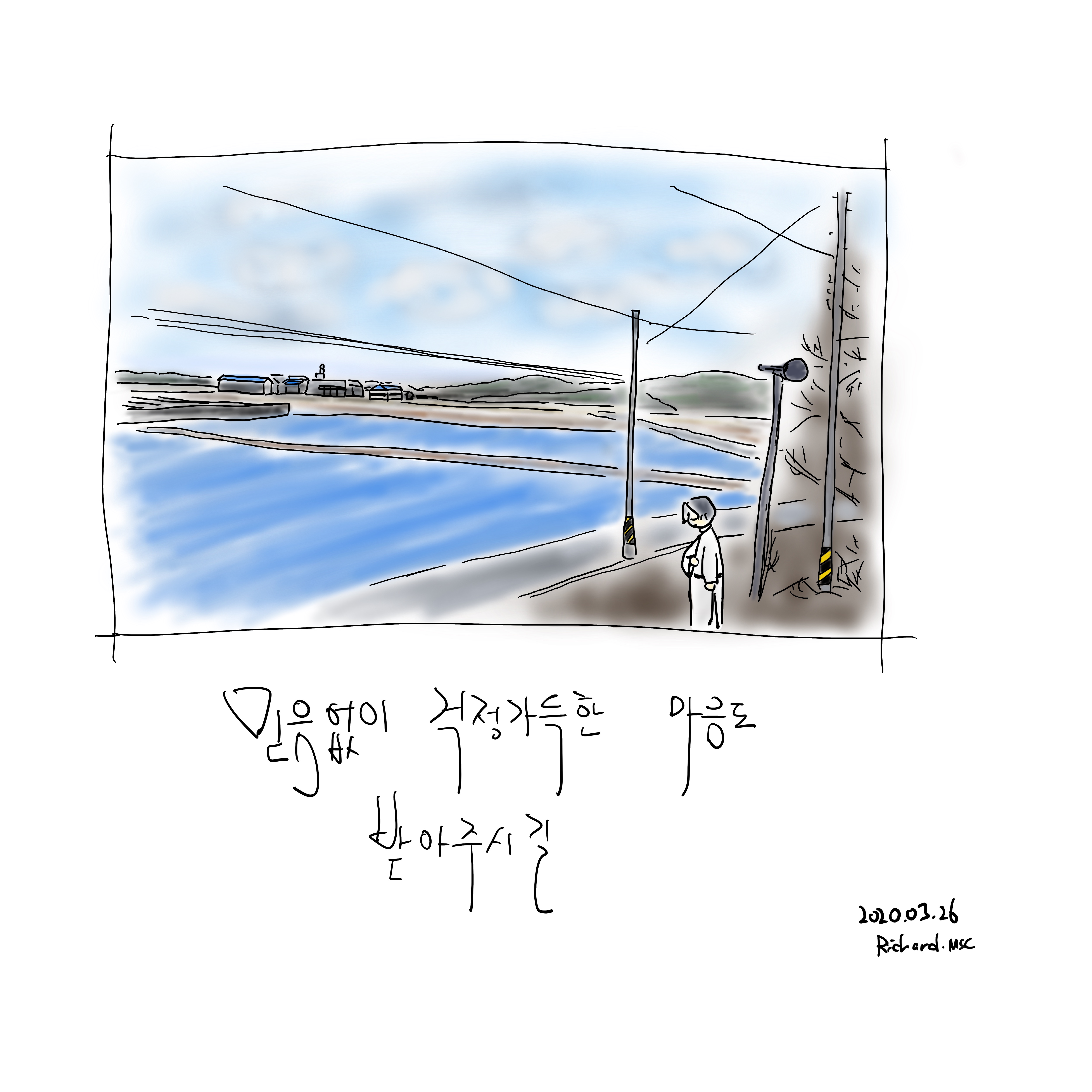 차를 몰고 돌아오는 길에 넓은 강화도의 논 사이로 난 작은 길을 택했습니다. 마치 바다처럼 넘실거리는 논의 물들이 참 아름답고 반짝여서 잠시 차를 멈추고 창 밖을 돌아 보았다가 심장이 멎는 줄 알았습니다. 넘실 거리며 끊임 없이 다가오는 물결 때문에 순간 차가 논으로 빠지는 줄 느껴졌기 때문입니다. 몇 번을 앞을 돌아보며 차가 안전하다는 걸 확인하고서도 옆을 돌아 차창 밖을 보고 줄지어 밀려오는 물결을 보고 있노라면 발끝부터 그 속으로 빠져드는 것 같아 다시 앞으로 난 도로를 돌아보게 됩니다. 저는 논에 댄 물에 이는 물결에도 두려움을 느끼는 약한 존재에 지나지 않다는 걸 또 알게됩니다. 길 위에 선 차 안에 앉아서 보면서도 말입니다.