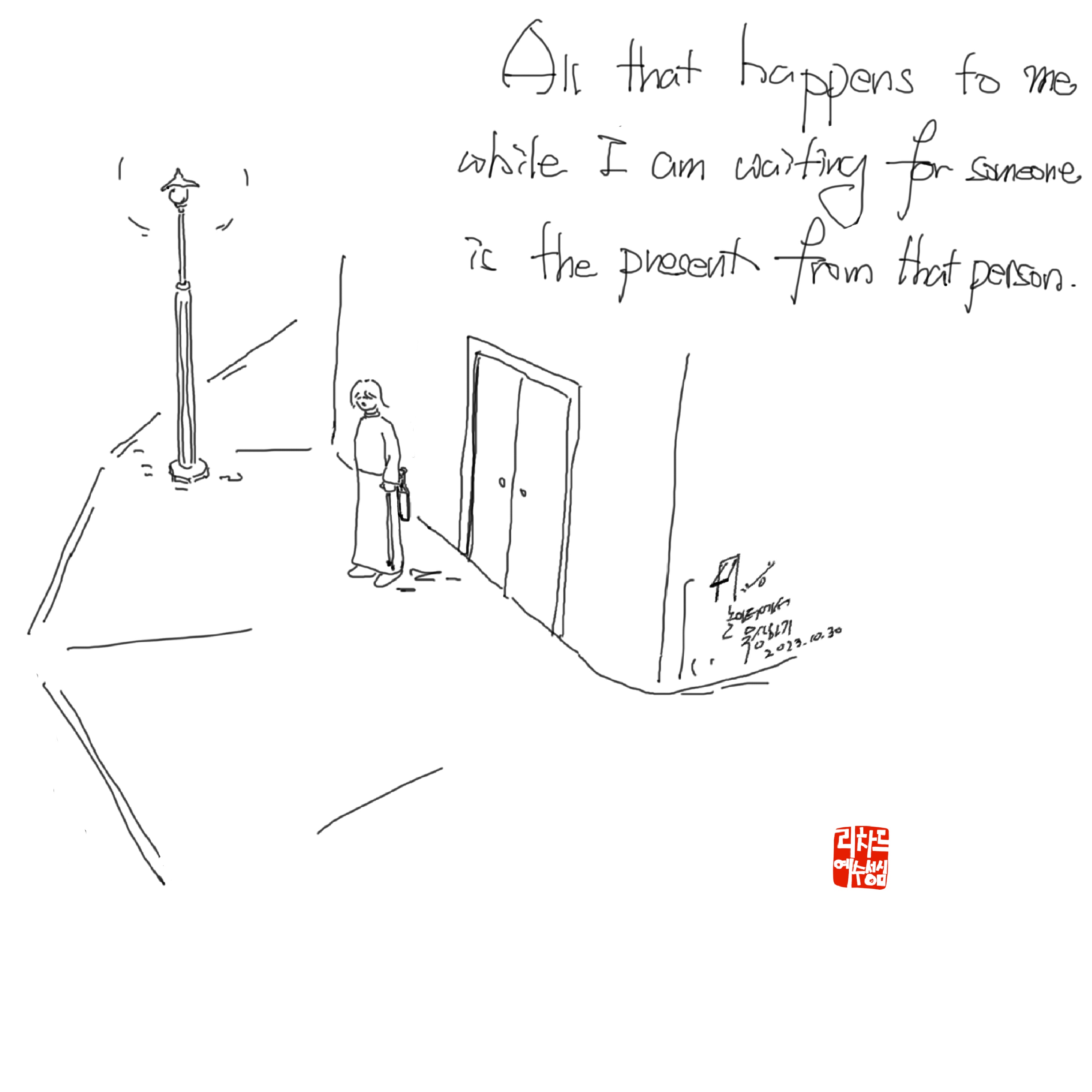 지나가는 사람을 보거나, 집에 두고 온 야옹이를 생각한다거나, 내일 있을 시험을 걱정한다거나, 또는 기다리는 사람과 함께 봤던 영화를 기억하기도 합니다. 문득 해결되지 않던 일에 대한 좋은 아이디어가 떠오르기도 합니다. 어떤 때는 기다림에 지쳐 그냥 갔는데 행여나 곧바로 그 사람이 온다면 지금까지의 기다림이 더 허망해진 것이 될까봐 발을 떼지 못하기도 합니다.