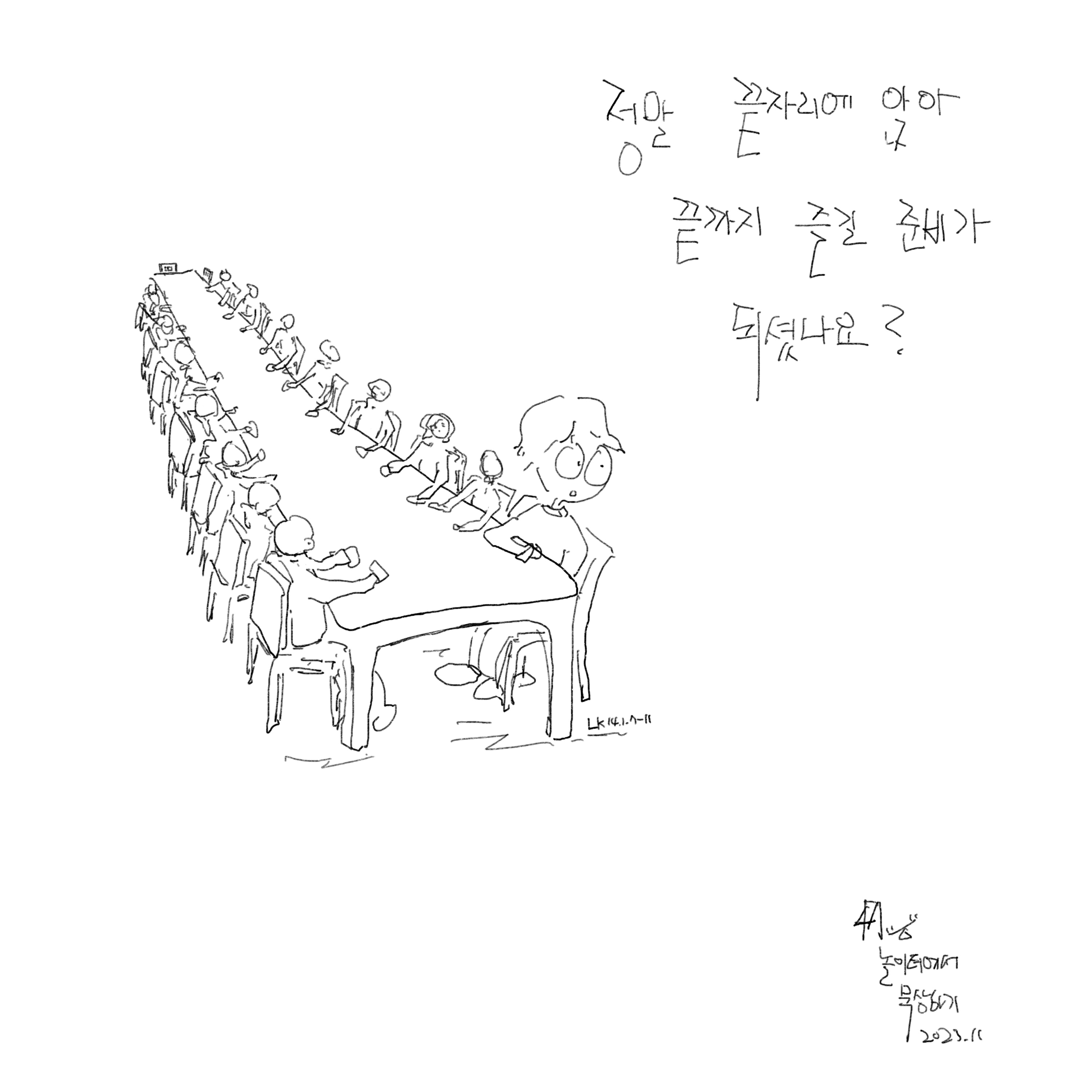 그러니 이래서야 제가 애초에 끝자리에 앉는 것이 도대체 무슨 소용이 있겠습니까? 그래서 묵상하게 됩니다. 끝자리에 앉는 사람이 되도록 하려면, 끝자리에 걸맞는 마음도 같이 준비해야 한다는 것을요. 그리고 끝까지 끝자리에 앉아 즐길 준비가 되어 있어야 한다는 것을요.